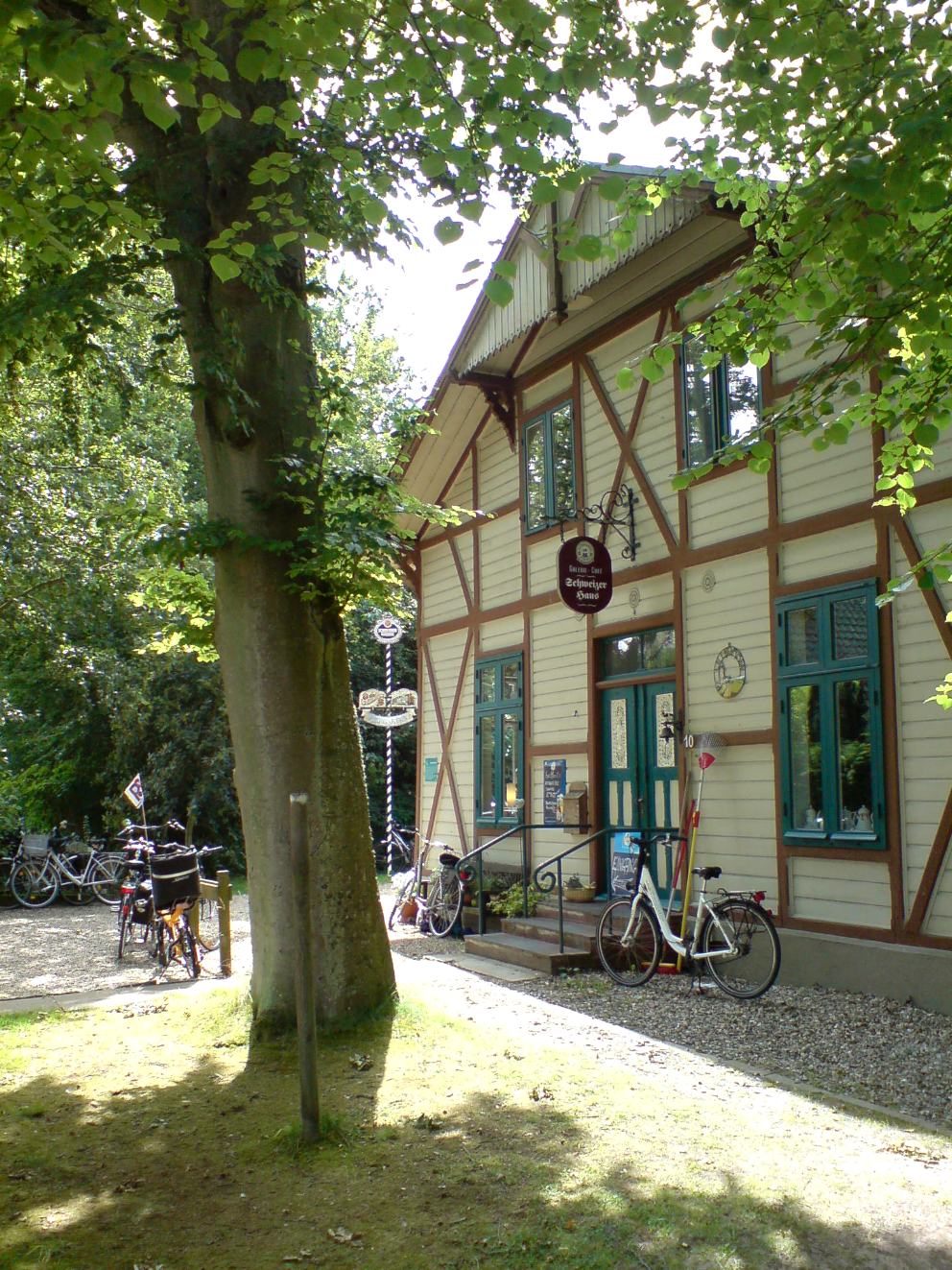 Ohne Orientierungsprobleme radeln Sie sodann auf einer schmalen Asphaltbahn eine ganze Weile direkt hinter dem Deich, bis diese zur Kreisstraße 36 leitet. Gut 700 m geht es auf dieser gen Süden, bevor Sie links abbiegend den – meist schwachen Kfz-Verkehr auf der Kreisstraße – schon wieder hinter sich lassen und beschaulich durch die Lande fahren können. Kurvenreich radeln Sie auf schmalen asphaltierten Fahrwegen bis nach Tating, wo sich ein Abstecher in den Ort anbietet, um beim Schweizer Haus (s. Foto) eine Rast zu machen und um dem