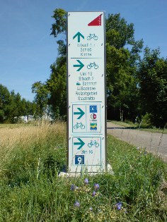 Die glatte Asphaltbahn führt zu einem Wasserkraftwerk und dann durch die Auen vorbei an diversen Teichen nach Erbach. Kurz vor der Stadt kommen Sie an die Eisenbahn heran, der Asphalt schwenkt nach links, und Sie unterqueren alsbald – gemäß dem nebenstehenden Radhinweis – die Schienentrasse mit Rechts-/Linksschwenk. Danach erreichen Sie mit einem Rechtsbogen über eine Brücke hinweg eine Vorfahrtstraße, der Sie geradezu folgen, sie aber noch vor der Auffahrt zur nächsten Brücke links/rechts versetzend bereits wieder verlassen.