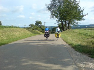 Die verlorene Höhe muss zurückerobert werden, wozu nach den letzten Häusern ein asphaltierter Radweg zur Verfügung steht. Erst wenn der Hügel gemeistert ist, geht es kurz vor einer Kirche rechts und damit – vorbei an einer Infotafel der Stadt Munderkingen – auf einer zweistreifigen Asphaltierten rauschend abwärts nach Algershofen.