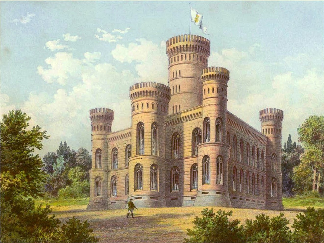 Der Architekt Steinmeyer bediente sich beim Entwurf Formen der Tudorgotik, um dem Jagdschloss Granitz (Abb.: Alexander Duncker), das eigentlich dem Vergnügen diente, noch einen Hauch von Wehrhaftigkeit anzudichten. Das Schloss wurde von 1837-46 für den Fürsten von Putbus errichtet und erhielt 1844 im Lichthof den 38 m hohen, von Schinkel konzipierten Rundturm, der einen schönen Ausblick über das südliche Rügen gestattet und dessen Aussichtsplattform über eine 154-stufige gusseiserne Wendeltreppe zu erreichen ist (für Radreisende sind die paar Stufen doch keine nennenswerte Hürde, oder?).